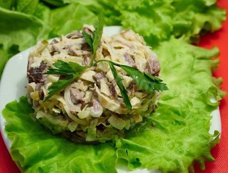 Изумительный вкус салата покорит сердце любого любителя мяса.