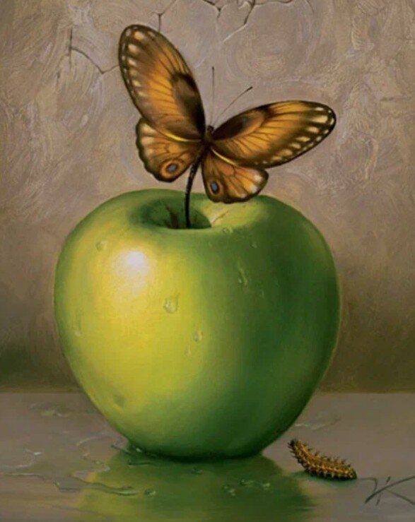 Иллюстрация - замечательная работа художника-сюрреалиста Владимира Куша "Зелёное яблоко" Мы видим гусеницу внизу. Проползая сквозь яблоко, она превращается в бабочку. Досуг рассчитан на то, чтобы мы превращались из гусениц в бабочек.