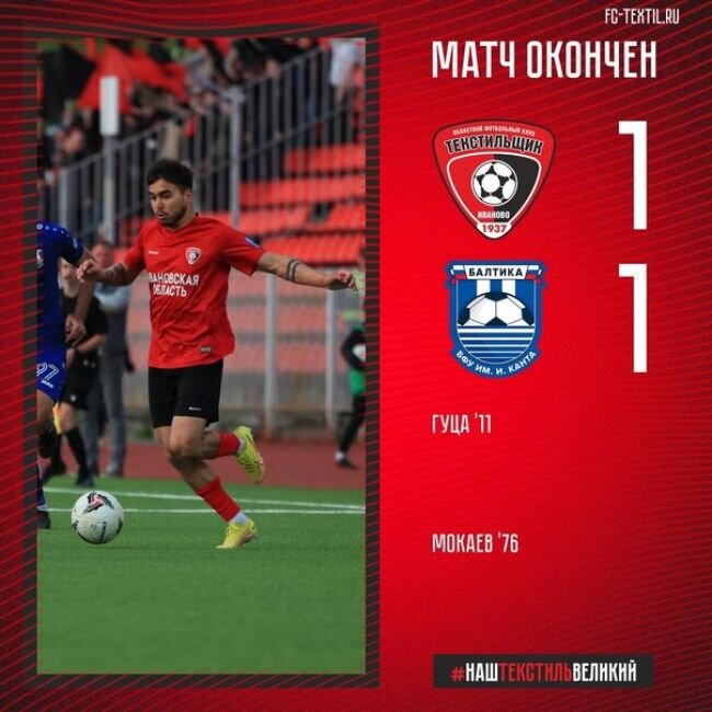 Сегодня в областном центре ивановский ФК «Текстильщик» встретился с командой из Калининграда «Балтика-БФУ им. И. Канта». Футбольный матч окончился ничьей. Счет в матче открыл игрок «Текстильщика» - Артем Гуца, который сегодня дебютировал в составе красно-черных. Первый мяч ивановская команда отправила в ворота соперника на 11-ой минуте. На перерыв команды уходили со счетом 1:0 в пользу «Текстильщика». Во втором тайме противник дал понять, что расслабляться ивановской команде не стоит. На 76-ой минуте в ворота красно-черных прилетает гол от футболиста калининградской команды Ислама Мокаева. Во время финального свистка на табло был счет – 1:1. Таким образом, это третий матч подряд, в котором ивановская команда сыграла с соперником вничью.