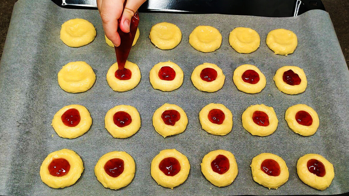 джем Способ приготовления: В глубокую миску выкладываем мягкое сливочное масло, всыпаем сахарную пудру, щепотку соли , перемешать лопаткой до однородной массы и взбить миксером в течении 3-4 минут (до светлого состояния) Вливаем яичные белки и хорошо взбить миксером до однородной массы. Частями всыпаем муку и замешиваем мягкое липкое тесто. Из теста делаем небольшие шарики и выкладываем на противень застеленный пергаментной бумагой Палец окунаем в растительное масло и делаем углубление В центр выдавливаем джем Подпишитесь на мой канал Ольга Лунгу Отправляем в разогретую духовку до 180 градусов и выпекаем 10-15 минут. Готовое печенье перекладываем на блюдо, завариваем чай и подаем к чаю. Приятного аппетита)