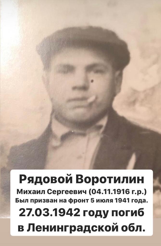 В преддверии Дня Победы мы попросили студентов и сотрудников нашего университета рассказать о своих героях: вспомнить родных и близких, отстоявших в годы Великой Отечественной войны нашу Родину, всех тех, кто не жалея жизни сражался на передовой, и стоял у станка в тылу, шел в атаку и рыл окопы… Только так мы можем сохранить историческую правду и передать эстафету памяти следующему поколению. Сегодня о своем герое расскажет проректор по научной работе ТулГУ Михаил Сергеевич Воротилин. «Мой дедушка Михаил Сергеевич Воротилинродился в 1916 году. Осенью 1940 года появился его сын, мой папа. А ровно через девять месяцев –5 июля 1941 года – мой дедушка был призван в ряды Красной Армии. С тех пор его в семье никто не видел. Весной 1942 года пришла трагическая новость – без вести пропал в Ленинградскойобласти. Долгие годы о судьбе дедушки в нашей семье не было ничего известно. Только в начале 2000-х годов, когда рассекретили ряд документов, узнали следующее: Михаил Сергеевич Воротилин, р