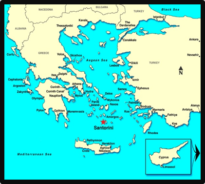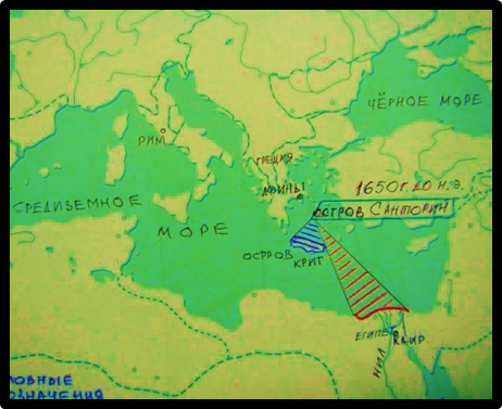 Ниже мной предоставлена ещё одна карта тих же территорий, правда с указанием места расположения острова Сантарин в акватории Средиземного моря. На верхней фотографии я указал вероятное направление губительной волны (цунами) в направлении острова Крит (заштриховано синим цветом), а в направлении дельты реки Нил (заштриховано красным цветом). Разумеется, от эпицентра взрыва, волна шла во все направления Средиземного моря, в представленной верхней фотографии я выделил и заштриховал красным цветом, для наглядности.