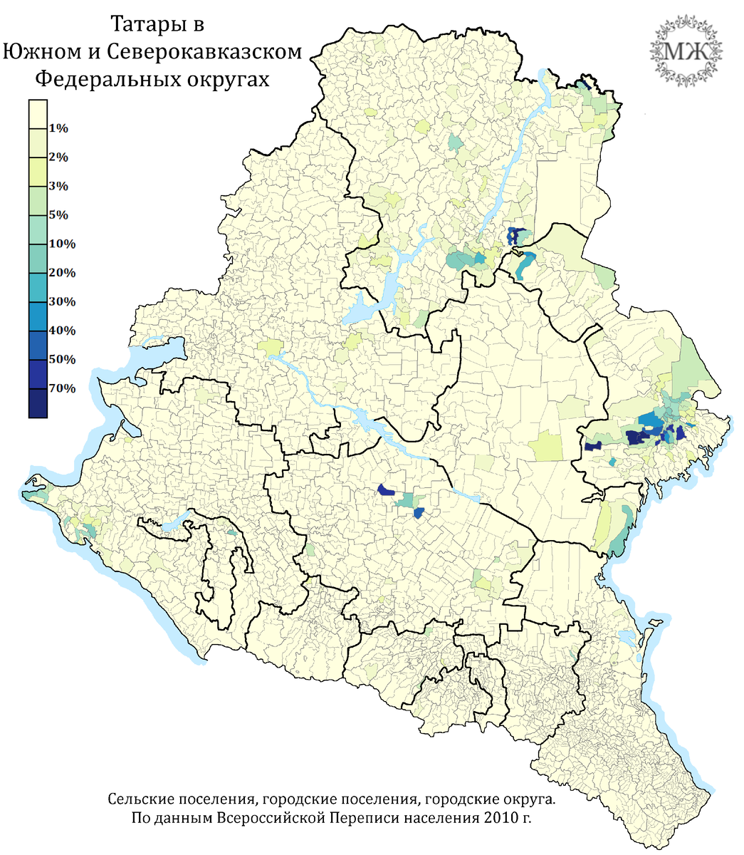 Подсчёт численности и долей каждого из ареалов делать не стал, т. к. даже примерное их объединение общую картину не покажет — татар очень много в городах, где их доля размыта, только в Ростове-на-Дону более 5 тысяч татар.