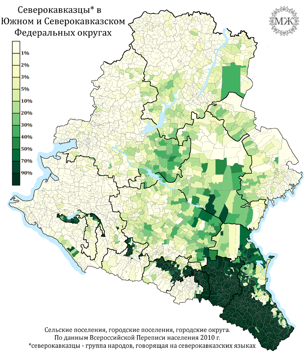 Данный пост вышел раннее на других платформах до существования аккаунта на Дзене. Информация, написанная здесь актуальна на момент выхода поста в Телеграме, ссылка на который есть в конце статьи. Ссылка на все ресурсы. Оригиналы изображений с полным размером и без вотермарок доступны на Бусти за две недели до выхода новой работы. Безусловно, северокавказская семья только на бумаге представляет из себя нечто целое. Однако, как культурный конгломерат на юге России, на них вместе лично мне было интересно взглянуть. Посмотрите и вы: Если говорить непосредственно о Кавказе, картина мало что даёт — в Чечне и Дагестане всё медленно размываются кумыки с ногайцами. При этом стоит заметить, что в том же Ногайском районе ногайцы живут на его южной части и теоретически, тёмно-зелёный цвет мог бы идти до Калмыкии и севера Ставрополья, отображая неразрывный кавказский ареал. Дальше идут ингуши, переходящие в условно разорванный ареал адыгов в КБР. Дальше уже никакой условной связи нет. Смотря далее
