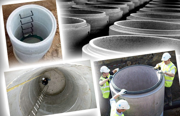 В сборных железобетонных колодцах также используются, как стандартные элементы конструкции бетонное основание (днище) и крышка колодца с отверстием для люка.