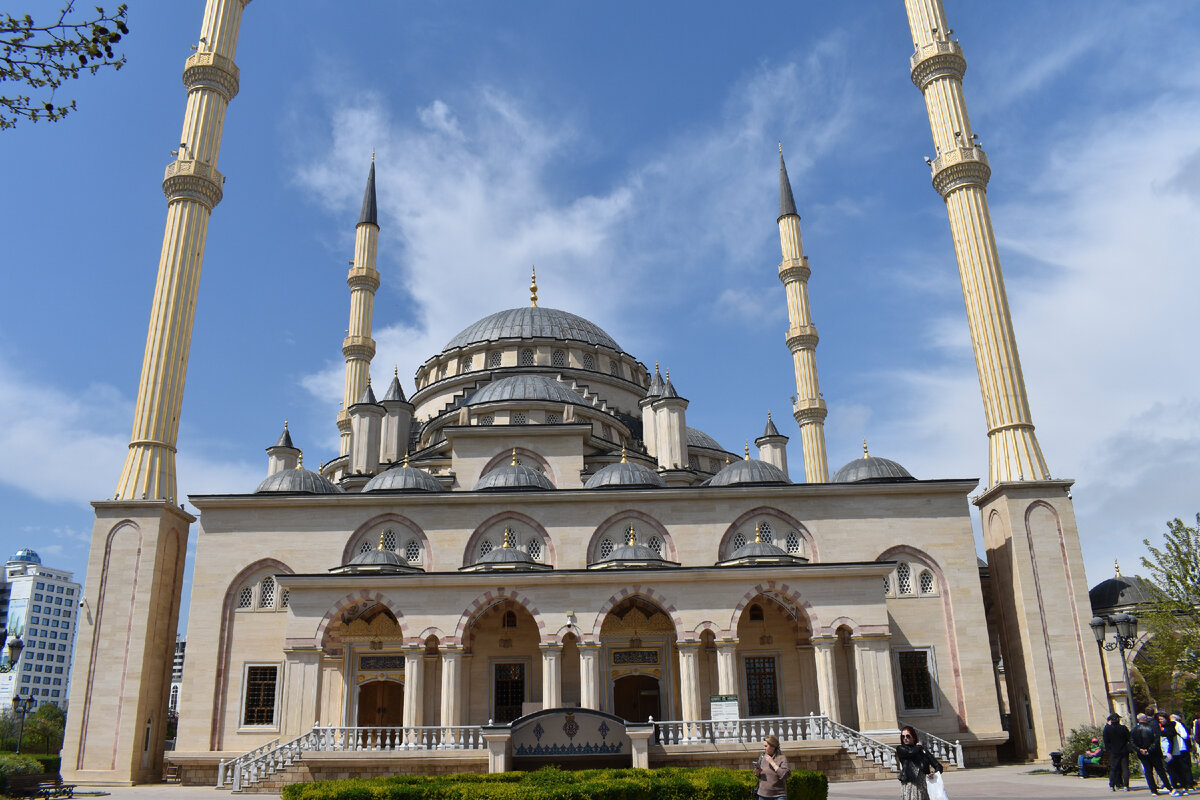 Первая моя поездка была в Грозный. Встала в 4часа утра, кошмар, не выспалась жутко, в 4-30 я стояла у дверей отеля, а в 5 часов мы уже выехали из Кисловодска в полном автобусе -45 человек. Этот маршрут имеет огромную популярность среди отдыхающих, хотя довольно тяжелый, почти 600 км в оба конца, но он того стоит. Мы проехали часть Ставропольского края, Кабардино-Балкарию, Северную Осетию, Ингушетию и только в 10-30 утра приехали в столицу Чеченской республики, конечно, была остановка для завтрака в станице Змейская , это Северная Осетия, где поели хычины и осетинские пироги. А потом остановка в Магасе, столице Ингушетии, здесь мы осмотрели мемориал памяти и славы. Осмотр столицы Чечни начали с мемориального комплекса славы им. Ахмата Кадырова. Здесь расположены конная скульптура Героя Советского союза Мовлида Висаитова, вечный огонь, колоннады, стела, барельефы героев Великой отечественной войны, в центре мемориала находится музей Ахмата Кадырова, в котором размещена экспозиция, посвященная жизни первого президента Чечни, но мы туда не заходили. Нас сопровождала гид - местная женщина, которая поведала, как после руин восстанавливали город довольно быстрыми темпами, при этом сохраняя облик довоенного города. Да, сейчас есть что посмотреть, широкие проспекты, красивые дома, небоскребы Грозный -Сити, и, наконец великолепная мечеть «Сердце Чечни», одна из самых больших в мире, очень похожа на голубую мечеть Стамбула. Она была построена в 2008г. Вот туда и подошел наш автобус.