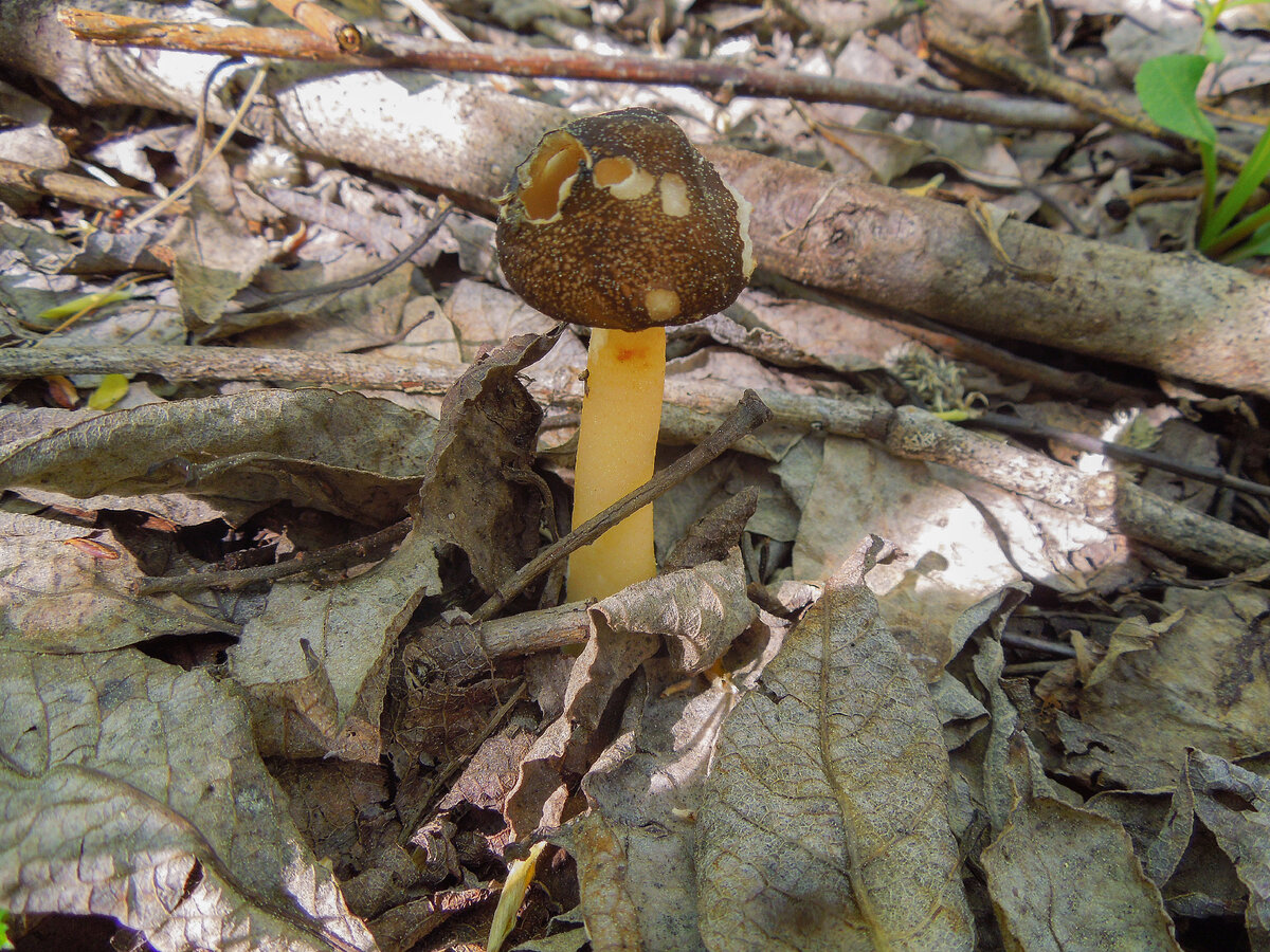 В конце сморчково-строчкового сезона вылезает на свет и такое чудо. Давно уже посредством интернет-ресурсов был заочно знаком с этим видом. Но одно дело увидеть на картинке. Гриб, как гриб, и должен расти и в наших лесах. А, значит, надо искать. Тем более, что весенняя "тихая охота" меня всегда увлекала особенно. И вот, три года назад, этот грибок, наконец, попался. Только чувства от находки были весьма противоречивы. С одной стороны, конечно, интересно, и новое открытие, а с другой... Гриб этот совершенно мал. В сморчковом мире, он навроде чесночника среди пластинчатых (кто знаком с последним, тот поймёт)). Но по-своему красив и неповторим. Гладкая, длинная, светлая ножка (почти как у сморчковой шапочки) контрастирует с шоколадной, гладкой опять же, шляпкой. Только если у сморчковой шапочки шапочка собственно, (извиняюсь за тавтологию) как детский головной убор - яркая, в игривых складках, то у шапочки конической - это деловая строгая шляпа. Так и ждёшь, что вот-вот раздастся сухое