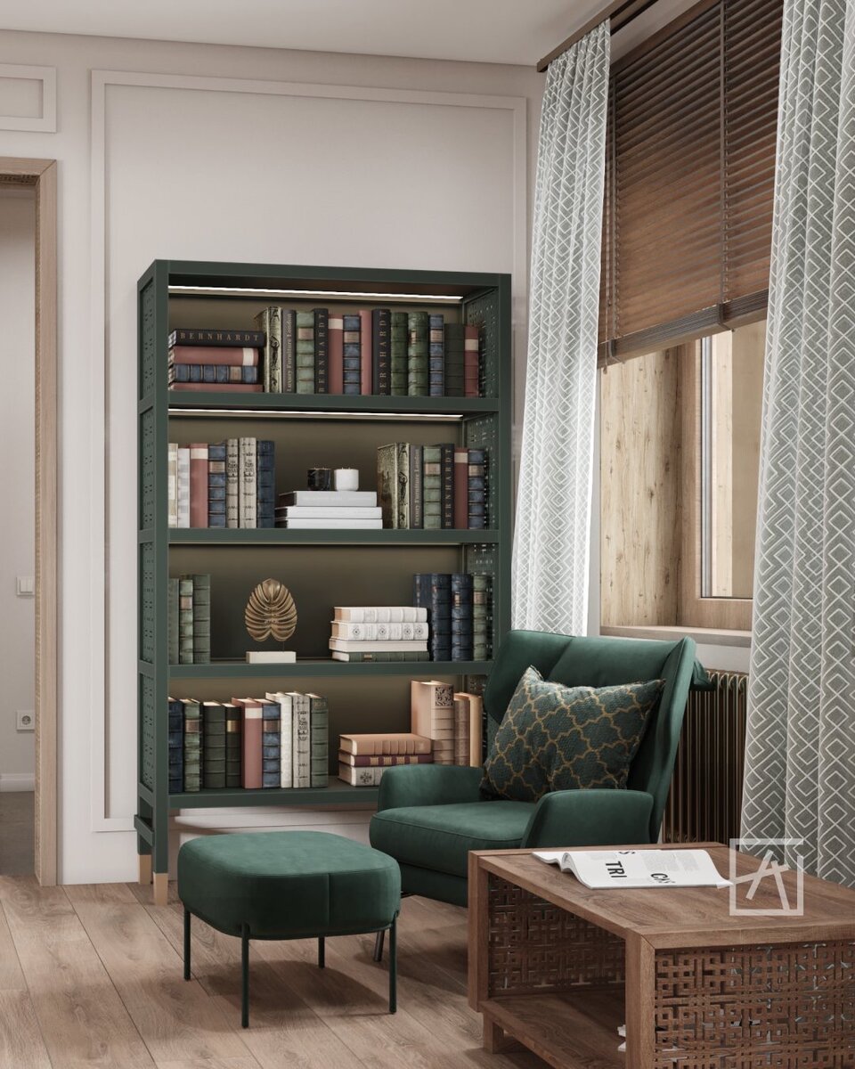 ➡️ Клиентам хотелось получить уютное пространство — сочетание неоклассики и марокканского стиля. Мы подчеркнули эту атмосферу с помощью декора, а также резных откосов на дверях. Эти элементы создаются на нашем производстве, которое позволяет нам не ограничивать себя в идеях и предложениях для клиентов ☑️ Выделили отдельное пространство для отдыха и чтения книг. Мебель выполнена в глубоких зеленых оттенках 😍 Ступени акцентной лестницы подчеркнули теплой подсветкой. Оцените этот яркий дизайн от 1 до 10 в комментариях 👇🏻
