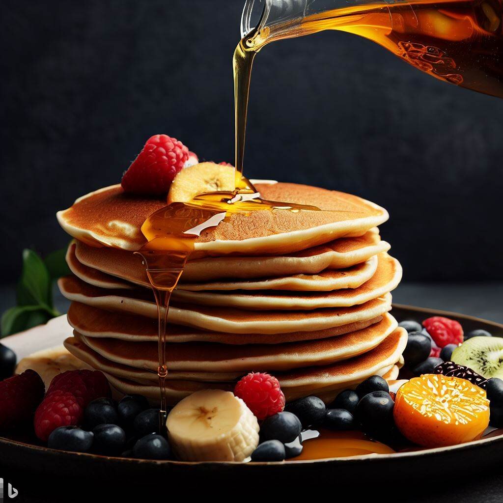 Сладкие и ароматные американские панкейки с кленовым сиропом и фруктами"