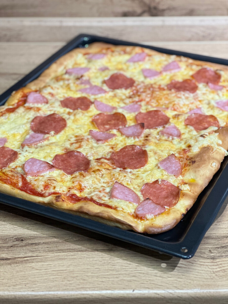 Его нужно сделать быстро, иначе весь смысл такой пиццы теряется. Но и чтобы вкусно было естественно. Как раз рецепт такого теста я вам сегодня покажу. Готовим: 1. Дрожжи, теплая вода и сахар. У меня дрожжи быстродействующие, поэтому через минуту я уже добавляю 1/2 муки (см. ингредиенты в конце рецепта) и необходимое количество соли. 2. Перемешиваю тесто ложкой, остаток муки на стол. Сверху тесто. 3. Сверху на тесто растительное масло и вымешиваем 3-5 минут. 4. Миску для расстойки смазываем растительным маслом, кладем тесто, сверху накрываем полотенцем. Оставляем в теплом месте минимум на час (тесто должно увеличиться вдвое). 5. Сразу смазываем противень маслом, сверху тесто и растягиваем его по противню. 6. У меня начинка такая: сыр, колбаса, салями. А соус: томатный кетчуп, томатная паста и растительное масло. 7. Моей духовке хватило 15 минут при 200 градусах. Режим конвекции с двумя нагревательными элементами (нижний и верхний). Ингредиенты: