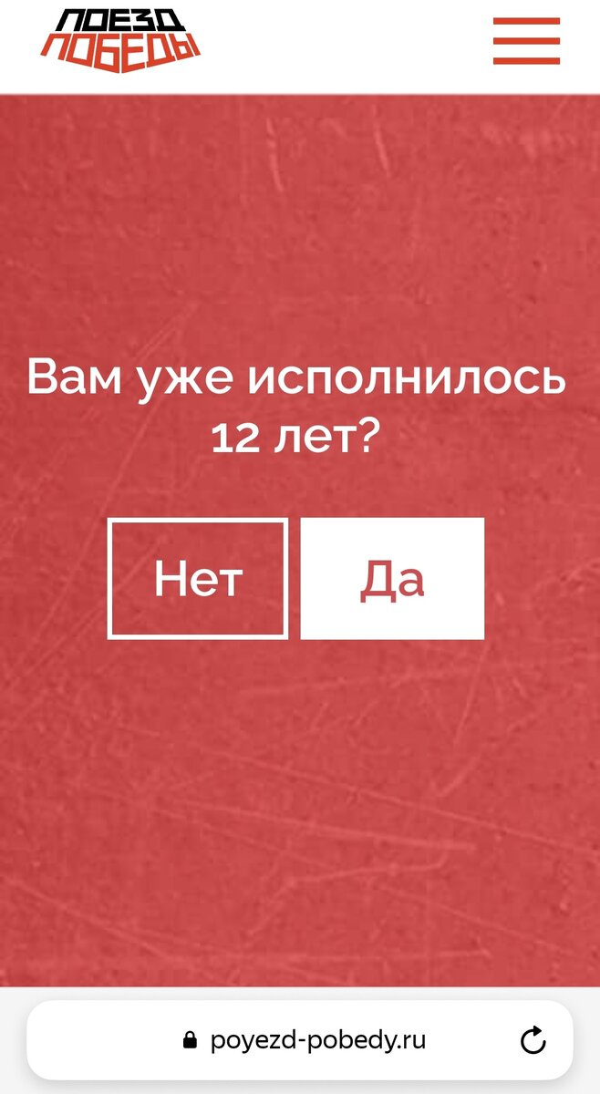 Дорогие друзья, я крайне возмущена (честно, долго подбирала слова поприличнее)! Вчера в наш город приезжал поезд Победы. К сожалению, я работала и лично увидеть его не смогла. Но очень хотелось оценить этот проект и - самое главное! - показать его детям. Мы зашли на сайт poyezd-pobedy.ru и попали на опрос о возрасте! Мы нажали "Нет" (не соврали, младшей дочке нет 12-ти) и увидели... Это чья-то глупая шутка или очередная недоработка Министерства культуры? Мой ребёнок достаточно взрослый, чтобы ему в интернете была доступна всякая грязь и мерзость, тупые песни, ролики, игры, стримы и рассуждения на тему "Кто круче: "Какашкоголовый" или "Унитазоголовый" (это не шутка!!!), но он не может пройти виртуальный тур и узнать про Победу прапрадедов, про подвиг наших людей, как на фронте, так и в тылу?!!! Почему детям младше 12-ти лет нельзя это увидеть? Обратите внимание на текст на следующем скрине: "Важно, чтобы наши студенты, наша молодёжь понимала..." - читаем мы. Но, дорогие мои