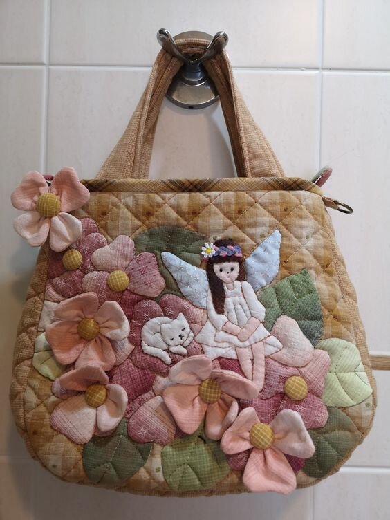 Объёмная аппликация сложный и трудоёмкий процесс но результат того стоит, такие сумки придают настроение, и радуют глаз. Эти прекрасные композиции на сумках сделанные в технике японский пэчворк. Просмотрела очень много информации о японском пэчворке и немного о том как делать такую красивую аппликацию, делюсь с вами. Особенности японского пэчворка: лоскутным шитьём в Японии занимались бедняки, из старых вещей шили что-то новое и старались эти вещи украсить аппликацией из разноцветных кусочков и получалась особенная и оригинальная вещь. Для аппликации применяли в основном натуральные ткани. Большое значение уделялось цветочным композициям. Мастера из Японии никогда не используют швейные машинки всё делают в ручную. Я не специалист в этой технике поэтому много фотографий и мало текста. Все фотографии из приложения Пинтерест, на многих подписан автор. Читайте статью где вы найдете 18 выкроек сумок и рюкзаков: Несколько схем пошива. Схема как делать тюльпанчик. Образец как пришивают апп