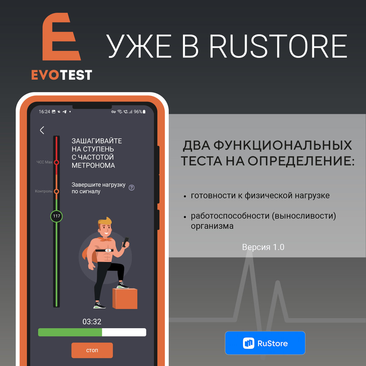 Версия приложения EVOTEST 1.0 доступна на Android версии 6.0 и выше. В новой версии исправлена ошибка покупки подписки и добавлена подписка на одного спортсмена. Цена тарифа на одного спортсмена всего 310 рублей. Также добавлены тарифы на 30, 50 и 100 спортсменов. В приложении 2 функциональных теста: 1. Определение готовности к нагрузки. Помогает не словить перетрен. Это активный ортостатический тест (одноканальное ЭКГ в состоянии покоя): 2 минуты лёжа, 2 минуты стоя. С помощью этого теста Вы узнаете свою готовность к физической нагрузке и сможете спланировать свою тренировку правильно: если есть признаки переутомления, Вам лучше тренироваться в “щадящем режиме”, если всё ок — можно смело выкладываться на максимум. 5 минут использования EVOTEST — и 99% того, что Вы избежите перетренированности, прислушавшись к рекомендации умного помощника. 2. Определение работоспособности организма. Это тест под нагрузкой (модифицированный Гарвардский степ-тест), который показывает, насколько вырастае