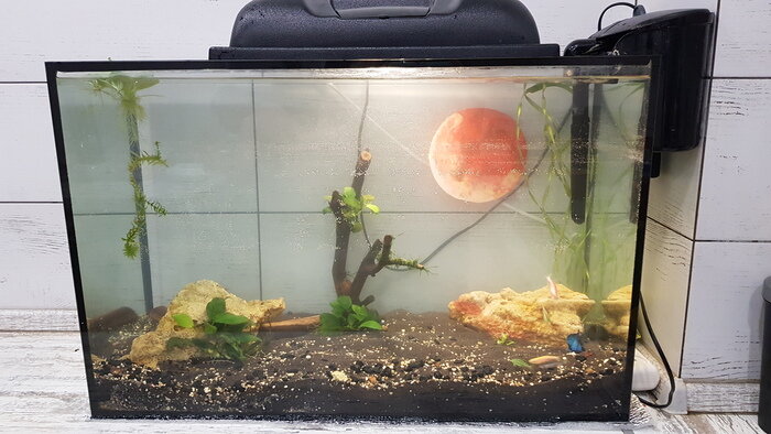 Чуть больше года прошло, как мне подарили аквас на 2 литра с петушком. Я вообще не знала, что с ним делать и как, поэтому обратилась к вам в Лигу аквариумистов за советами. Получила их великое множество, за что спасибо всем большое. Сегодня я запустила аквариум на 90 литров. Долго к этому шла, месяц вымачивала корягу (варила и опять вымачивала), чувствуя себя словно ведьма из мульта вунш-пунш. Подбирала тихий фильтр и грунт. Пока это выглядит вот так. Дальше в планах найти тёмный фон (луну нарисовала акрилом с наружной стороны) и подобрать еще растения. Хочется попробовать сделать из коряги дерево с мхом на ветках. Спасибо всем за советы, которые были даны по предыдущим постам и всем тем, кто даст советы к уже имеющемуся аквариуму. Пост автора G00dM00d. Комментарии