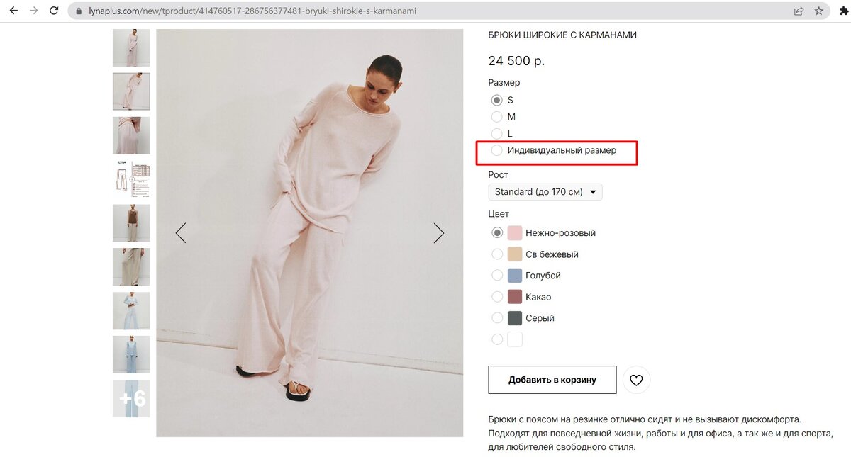Индивидуальный заказ — именно такая функция доступна на странице каждой модели LYNA+ на сайте. Это предполагает внесение коррективов в размер/длину изделия или запрос доступного в коллекции, но отсутствующего среди готовых изделий цвет (при его наличии на производстве). Это бесплатный сервис, позволяющий отойти от стандартных параметров к индивидуальным. Комментарии по заказу нужно сообщить по номеру +79778500133 (wa/tg), а так функция выглядит на сайте.