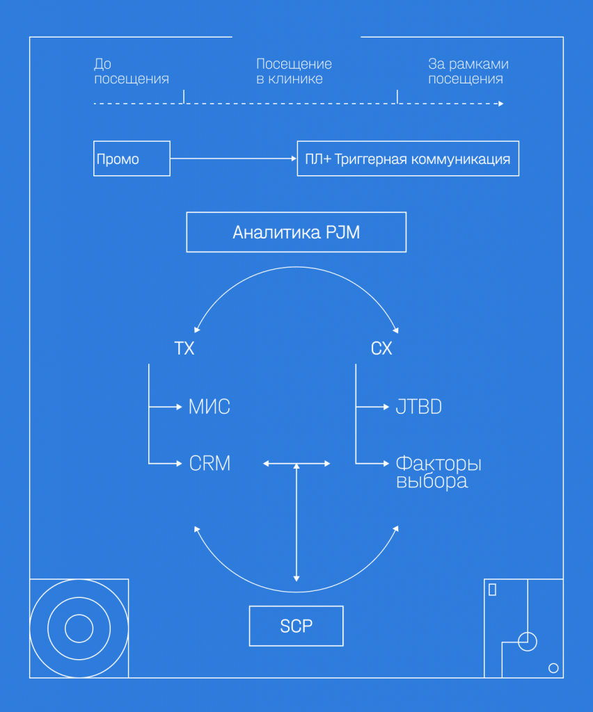 - отслеживать поведение клиента до клиники, в клинике и между процедурами (как в офлайн точках контакта, так и онлайн)