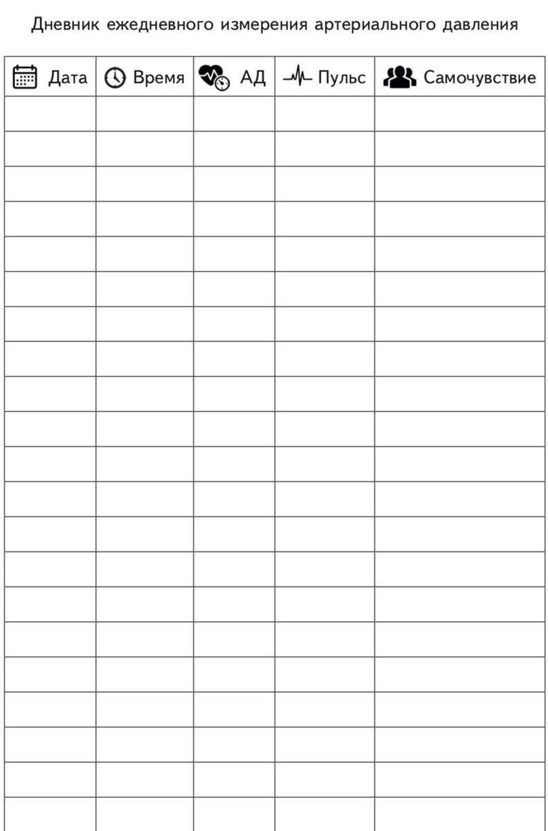 Дневник самоконтроля артериального давления служит для регистрации показаний тонометра через определенные промежутки времени. ✔️Он нужен для того, чтобы ваш лечащий доктор смог наиболее точно оценить картинку вашего заболевания и точно подобрать дозировку лекарств ✔️Для измерения артериального давления в домашних условиях лучше приобрести полностью автоматический или полуавтоматический прибор, но не ручной со стетоскопом. Правила измерения артериального давления. 1. Измерять давление рекомендуется в одно и то же время 2 раза в течение суток, утром и вечером, с интервалом приблизительно 12 часов. Например, в 7:00 и 19:00, в 8:00 и 20:00, в 9:00 и 21:00. Чтобы повысить точность измерений, можно проводить серию из 3 замеров с интервалом между ними 2-3 минуты. Это особенно важно для больных аритмией. 2. В течение 1 часа перед измерением артериального давления следует исключить курение, употребление кофе и крепкого чая, тяжелые физические нагрузки. Перед самым замером необходимо ус