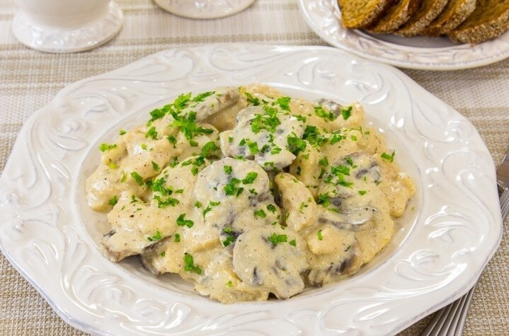 500 гр. филе курицы, 0.5 литра куриного бульона, 150 гр. свежих шампиньонов, Сок половинки лимона, Пучок зеленого лука, 30 гр. пшеничной муки, 20 г сливочного масла, 1 ст. ложка сметаны, Специи и соль. Начинаем. Берём филе куриное. Моем его, просушиваем. Теперь нарезаем кубиками примерно 2х2 см. Слегка обваливают кусочки в муке. На глубокой сковороде прогревают растительное масло, добавляют в него небольшой кусочек сливочного масла и недолго обжаривают мясо, но не до румяности. Сверху вливают предварительно сваренный бульон (можно сделать его из бульонного кубика), доводят до кипения и тушат на медленном огне, пока не выпарится часть жидкости. Берём наши грибочки, промываем их. Нарезаем так, как нам захочется. Теперь можно их добавить к нашей курице. Тушим на средем огне примерно минут 15-20. Сверху вливают предварительно сваренный бульон (можно сделать его из бульонного кубика), доводят до кипения и тушат на медленном огне, пока не выпарится часть жидкости. Теперь можно и подавать к