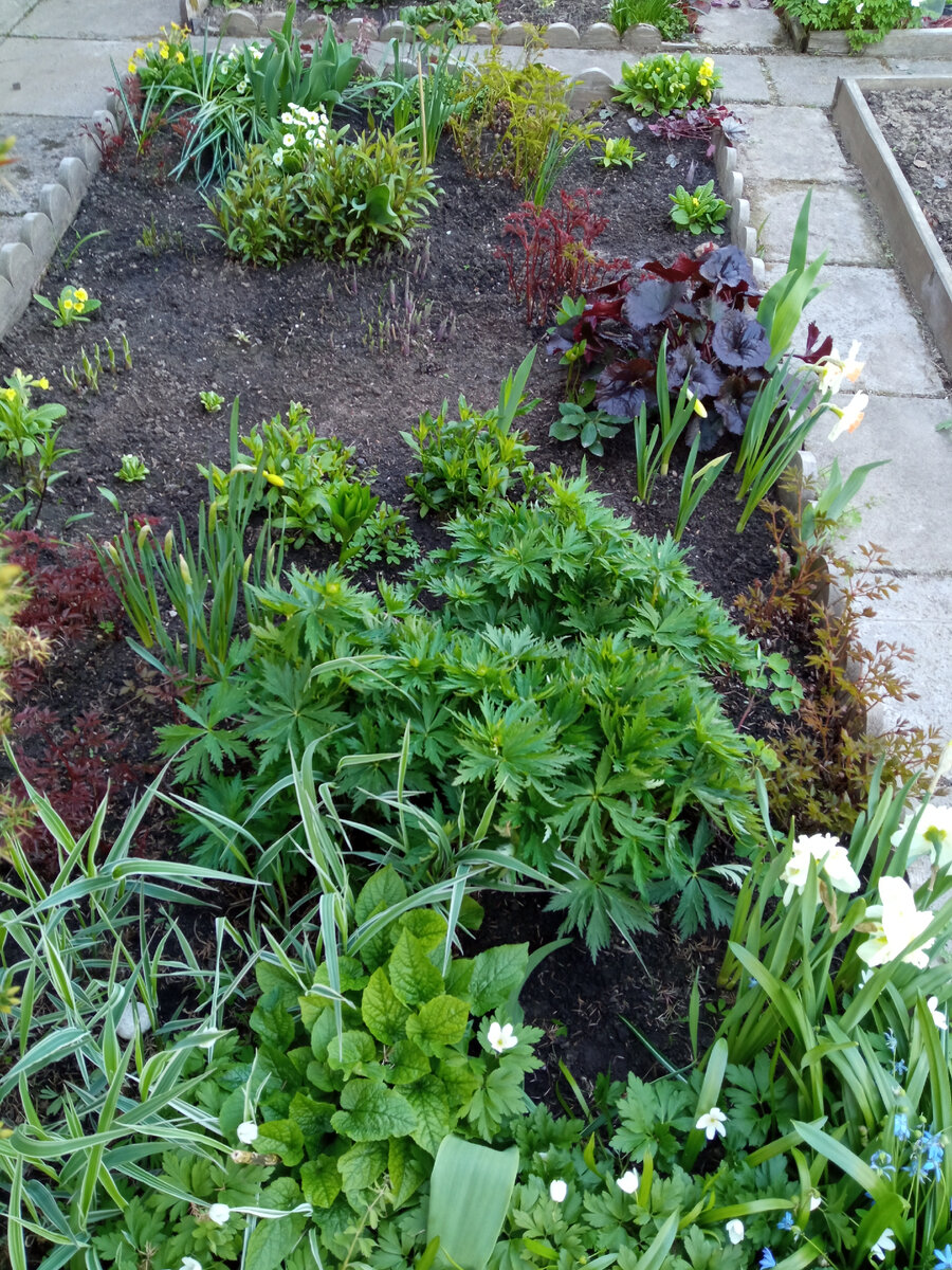 Не так давно я писала про самый молодой цветник в моём саду. Весной он выглядит ярко и симпатично. А теперь хочу рассказать про другой цветник, старый, которому уже много лет. Несмотря на устоявшуюся основу, он ежегодно подвергается небольшим переделкам. Про этот цветник, расположенный с восточной стороны дома, я уже писала. А сейчас покажу, как он выглядит в начале мая. Конечно, он ещё не такой пышный, каким будет летом, но тоже весьма приятный. Цветник прямоугольной формы, с очень низеньким заборчиком. Многолетники, цветущие в мае, подобраны так, чтобы окраска цветков находилась в пределах тёплой цветовой гаммы. В основном, это жёлтый и близкие к нему цвета: персиковый, кремовый, лососевый, оранжевый. Здесь много примул с различными оттенками жёлтого, нарциссов, к середине месяца зацветёт оранжевая купальница. В углу цветника растёт сеянец примулы высокой (primula elatior) с интересной окраской цветков: жёлто-кремово-оранжевой. В другом углу посажена его "мамаша", у неё более