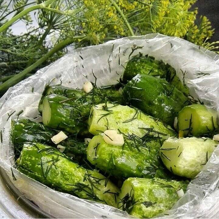 Друзья, всем привет! На подходе сезон первых огурчиков свежего урожая этого года. Поэтому, сегодняшняя статья посвящена приготовлению хрустящих, малосольных огурцов быстрого приготовления.Хрустящие малосольные огурцы в пакете с чесноком и укропом Такие огурчики полностью готовы к употреблению через 2-3 часа после засолки. Но для приготовления требуется брать плоды небольшого размера. Желательно, чтобы они были собраны в этот же день, и чтобы не находились на солнце Ингредиенты 1.Помыть овощи и зелень, просушить. Каждый огурец нарезать на 2-4-6 частей вдоль, предварительно срезав кончики. Получатся продолговатые тонкие кусочки, которые просолятся быстрее, чем целые плоды. Если хотите солить огурцы целиком, их нужно почистить. При посоле без кожуры их можно будет пробовать примерно через час-полтора. 2.Укроп мелко покрошить, а чеснок очистить от шелухи и порубить тонкими пластинками. 3.Взять 2 чистых полиэтиленовых пакета, сложить один в один. Поместить внутрь огурцы, высыпать укроп и че