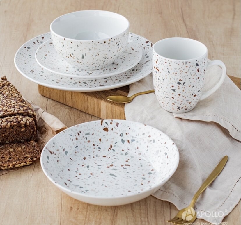 Ну а это знакомая многим посуда из Фикс-прайс. Коллекция Терраццо. На фото суповая и обеденная тарелки. Сделаны из фарфора. На сайте в Фиксе написано, что тарелки из фаянса. Я разницы никакой не увидела.