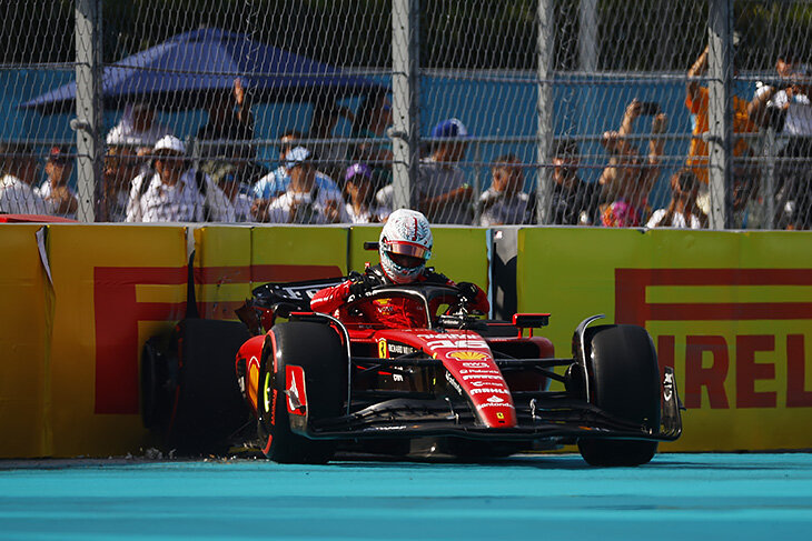 Перес – на поуле. Квалификация на Гран-при Майами закончилась крайне необычной стартовой решеткой: Перес на поуле, второй – внезапно Алонсо, третий – Сайнс, четвертый – Магнуссен на «Хаасе», пятый – Гасли на «Альпин»… Что случилось? Просто Шарль Леклер в фирменном стиле немного треснул на решающем круге – когда «Феррари» могла претендовать на поул, рисковать нужно было по максимуму, но таланта на обработку всех возможных сложностей с машиной и треком не хватило: Вот больше повторов со всех возможных камер – включая бортовую с разочарованным поколачиванием руля. Эмоции вновь победили. Красный флаг и конец сессии для всех – потому и победил тот, кто проехал лучший базовый установочный круг. И Леклера среди них тоже не оказалось – ведь первый круг он тоже запорол вот такими ошибками на торможениях: Насколько же Леклер дополнительно рисковал? Вот один из поворотов незадолго до вылета относительно траектории обладателя поула Переса – Шарль просто сожрал поребрик, а на высоких скоростях он с