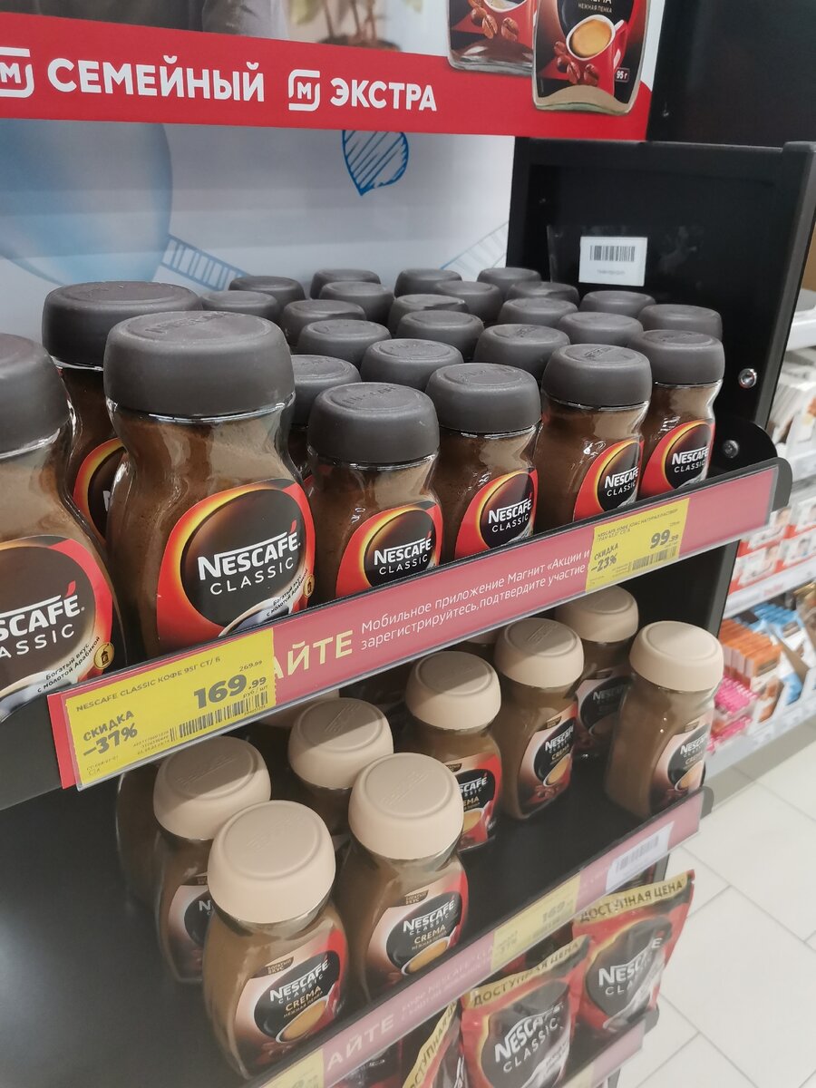 Кофе был первым в списке покупок, поэтому, дабы не забыть про него, подошла сразу к нужному отделу. Растворимый для меня весь на один вкус почти, не вижу большой разницы, поэтому выбираю по цене. На секундочку, в другом магазине самым недорогим был "Jacobs", который обошелся в 279 рублей, а здесь вон "Nescafe" такого же объема красуется за 169. Если выбирать банку поменьше, то ценник и вовсе будет 99 рублей, что совсем скромно нынче для кофе.