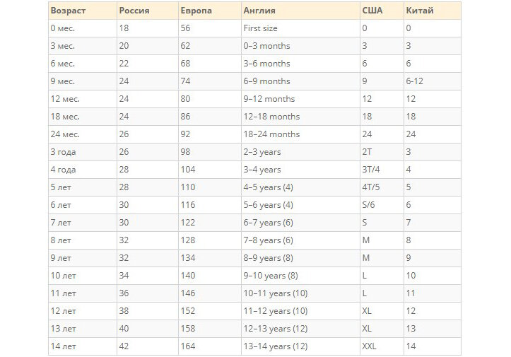 В разных странах по-разному обозначают размеры детской одежды. В России свои правила — размеры указываются цифрами. В некоторых, например в Китае и США, принято обозначать размеры детской одежды по возрасту. Это удобно в раннем возрасте, когда родители могут более или менее точно предсказать, какого роста будет малыш даже через полгода. После года увеличение длины тела идет скачками и неодинаково у разных детей. Поэтому даже опытные родители иногда не могут точно сказать, размер 122 на какой возраст ребенка. Даже в одной семье вещи такого размера первый ребенок может надевать еще до школы, а второму они будут впору только к 8 годам. Поэтому опытные родители ориентируются на размер одежды для детей по возрасту только до года малыша. После года удобней пользоваться обозначениями размеров, принятых в странах Европы, — по росту ребенка.