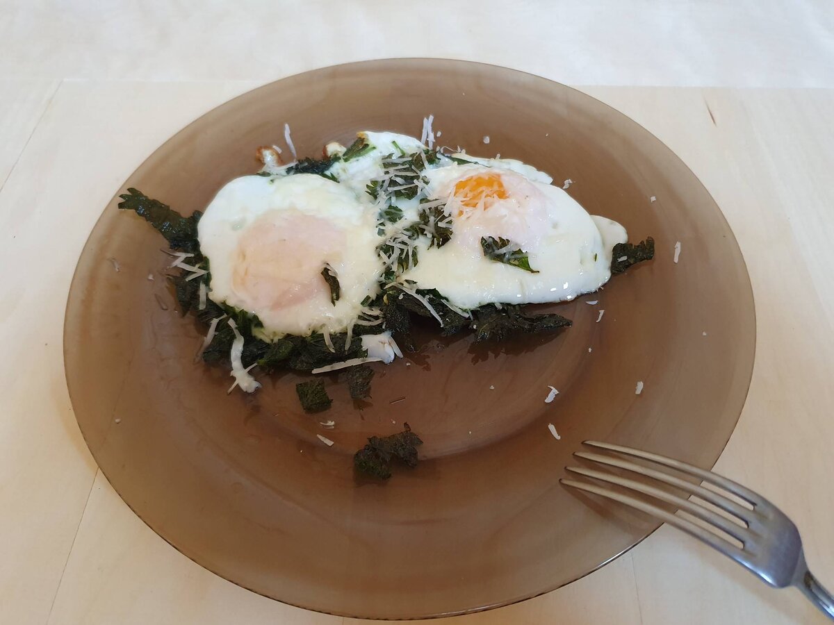 Один из простых завтраков дома и в походе это яичница. Хотим удивить друзей, родных - добавляем крапиву. Такой завтрак - самое то готовить весной, когда организму особенно требуются витамины, а крапива еще молодая и мягкая. Из расчета порции на 2 яйца нам потребуется: 5 веточек молодой крапивы, щепотка соли и столовая ложка растительного масла. По вкусу потребуется перец и твердый сыр. Крапиву перед готовкой тщательно промыть в холодной воде, затем порезать крупно. Переходим к внесению ингредиентов на разогретую сковороду. Вливаем масло, добавляем порезанную крапиву. Далее сразу бьем яйца, не дожидаясь что крапива поджарится или протушится в сковороде. Вносим щепотку соли и накрываем крышкой. В идеале глазунья — это когда желток остается жидким, а белок схватился, если предпочитаете полную прожарку, то готовим чуть дольше. Приготовление блюда контролируем по нужной прожарке яиц. Готовую яичницу выкладываем на тарелку. Трем на терке немножко твердого сыра, сразу на горячее блюдо и посы