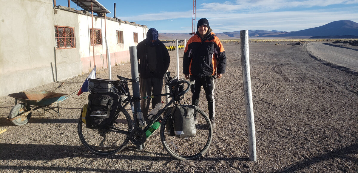 5 мая С утра меня напоили грячим кофе с бутербродом. Отблагодарил охранника 50-ю боливиано. Выехал в 7.40 утра. По дороге преодолел перевал с высотой 5314 м. - если верить программе. Сегодня высоты практически не ощущал. Может благодаря тому что был свеж и до перевала не сильно устал. Снова весь день дул сильный ветер на всем продолжении пути. Были мысли проехать автостопом до границы. Но с самого утра мимо меня в попутном направлении проехало всего 5 или 6 джипов, только один остановился и то машина была забита полностью товаром, а остальные проехали мимо. Пришлось ехать своим ходом. Проехал 42 километра по дикому ветру и как оказалось при низкой температуре- всего 4 градуса. На одном из перевалов меня подобрал грузовик. Который провез меня 9 километров до поворота к озеру Салада. Еще 13 километров проехал по недавно очищенной грейдером дороге. Это только ухудшило дорожное полотно. Если раньше дорога была твёрдая то после грейдера стала вязкой из за мелких камней, песка и рыхлой зе