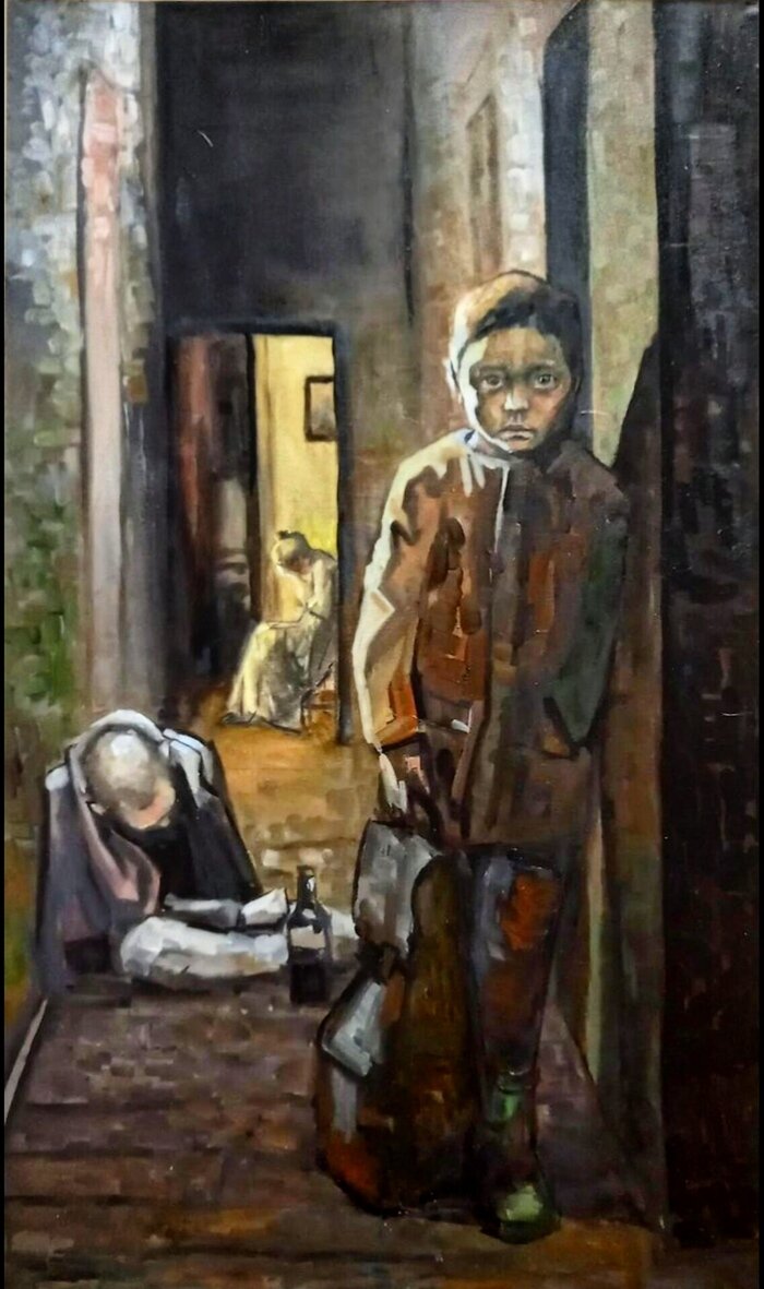 Всем здравствуйте. Я студентка художественного училища. Каждый год мы в течение 4 лет рисуем по 4 композиции в год. Композиция это тематическая картина с сюжетом. И затем, одну из них можно взять на заключительную дипломную работу. Я долго думала, что же я хочу изобразить на диплом, ведь тема должна тебя трогать и быть тебе близка, так сказать я считала, что тему нужно пропустить через себя. И наконец однажды я поняла, что я хочу рассказать. Я ехала в троллейбусе и на одной из остановок зашли отец с сыном, отец был прилично поддат, и по лицу сына лет десяти было видно как ему стыдно и больно, отец что-то агресивно говорил сыну, сын нехотя отвечал. Я вспомнила себя в детстве, как единственным детским желанием на новый год и дни рождения было, чтобы папа бросил пить. Я думаю многие меня и этого мальчика поймут. Мне повезло, ради меня отец все-таки завязал. И мне захотелось написать такую картину глядя на которую, тот самый папа, переосмыслил свою жизнь, понял страдание близких людей и постарался исправиться. Но к сожалению просмотр проходит в отсутствие студентов и комиссия просто решила, что тема слишком минорная для дипломной работы. И брать мне её не советовали. В итоге я пишу на диплом тему про братьев Никитиных (основатели цирка). А этой картиной я просто поделюсь с вами.