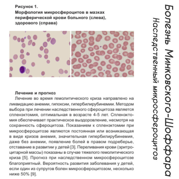 Наследственный микросфероцитоз (болезнь Минковского-Шоффара) Страдают заболеванием преимущественно мальчики Причина - мутация гена, кодирующего синтез одного из белков (спектрина, анкирина) цитоскелета мембраны эритроцитов. Аутосомно-доминантный тип наследования Триггером обострения может стать: вакцинация, инфекции, стресс, беременность и т.д Патогенез. Мембрана (каркас) эритроцитов становится дефектным, т.к не происходит выработки мембранного протеина- белков, которые встраиваются в клеточную мембрану (проще говоря, не хватает кирпичей в стенке дома, т.к на заводе выпускают деформированный товар из-за поломки прибора). Клеточная стенка эритроцитов деформирована, что повышает проницаемость для ионов натрия, а они приводят к набуханию и скоплению воды в эритроците (опять же, из - за дефекта в кирпичной стене образуется турбулентный поток, куда стремится попасть ветер и дождь, образуя в доме лужи и влагу). Эритроциты меняют свою форму с двояковогнутой на сферическую и уменьшаются в размерах. Продолжительность жизни тоже снижается. Если в норме эритроцит живёт 120 дней, то деформированный эритроцит будет жить максимум 10 дней. Т. К мембрана красных кровяных телец деформирована, то соответственно они теряют свою пластичные свойства, они больше не могут проходить через суженные участки синусоидов селезенки, что заставляет макрофагов (служба надзора нашего организма) разрушать неправильный эритроцит - внутриклеточный гемолиз. Постоянное разрушение красных клеток компенсаторно усиливает процессы костномозгового кроветворения. Постоянный гемолиз (разрушение) эритроцитов приводит к повышению неконъюгированного билирубина. (здесь нужно вспомнить распад гемоглобина. Если вкратце, то когда эритроцит разрушается, гемоглобин выходит наружу и связывается с переносчиком, после чего переносчик доставляет его в селезенку, переносчик отщепляется и гемоглобин распадается, преобразовается до билирубина - непрямого (токсичного), чтобы он стал прямым (не токсичным), необходимо связаться с глюкуроновой кислотой с помощью специального фермента в печени). Так вот, непрямой билирубин направляется в печень, чтобы связаться с глюкуроновой кислотой. Но печень не успевает "обслужить" весь билирубин, что приводит к накоплению в организме неконъюгированного билирубина и развивается надпеченочная желтуха. Классификация по степени тяжести Лёгкая. Небольшой гемолиз. Селезенка увеличена незначительно. Уровень гемоглобина 100-120 г/л Средняя. Умеренный гемолиз и спленомегалия. Кожа желтушная. Гемоглобин 80-100г/л Тяжёлая. Выраженный гемолиз, большие размеры селезенки, скелет деформирован. Высокая вероятность летального исхода. Уровень гемоглобина 60-80 г/л. Потребность в постоянных гемотрансфузиях. Бессимптомная (латентная), когда человек даже не подозревает, что болен. Небольшое количество микросфероцитов и высокий ретикулоцитоз. Симптомы. Постепенное начало. Тяжесть определяется степенью гемолиза. -Желтушный синдром (кожные покровы, склеры, с/о) -Анемический синдром (бедность кожи и с/о, снижение ад и тахикардия, головокружение) - Спленомегалия (боль и тяжесть в левом подреберье) Печень увеличена незначительно. Если болезнь проявилась в раннем возрасте, то будут стигмы дизэмбриогенеза (деформация костного скелета) - башенный череп, седловидный н
