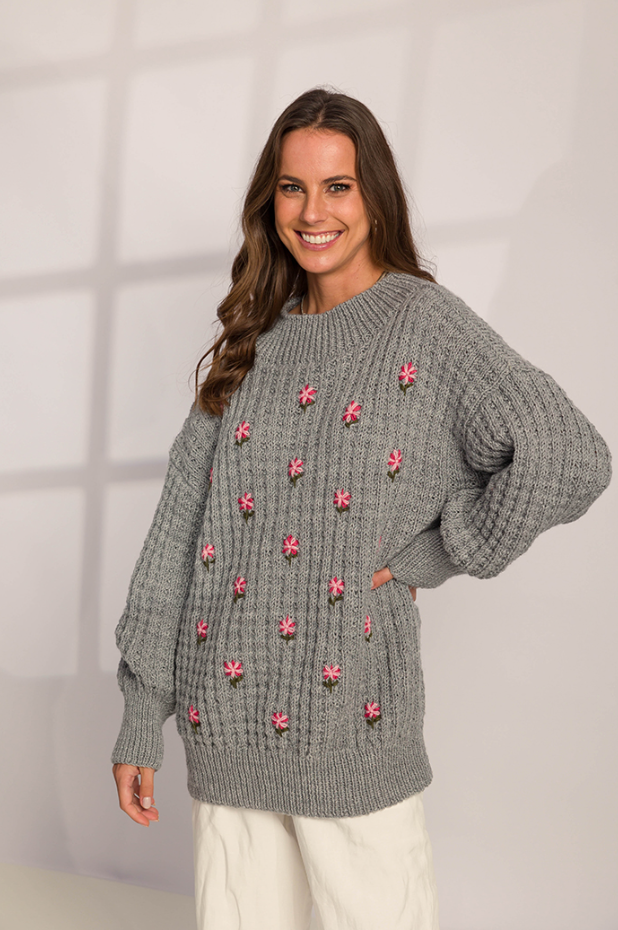 Пуловер спокойного серого цвета вывязан узором из чередующихся лицевых и изнаночных петель. Свободные широкие рукава, широкие планки манжет, низа пуловера и выреза горловины делают модель уютной и мягкой. Изюминка - мелкие двух оттенков розового цветочки, вручную вышитые по всему полотну пуловера.
