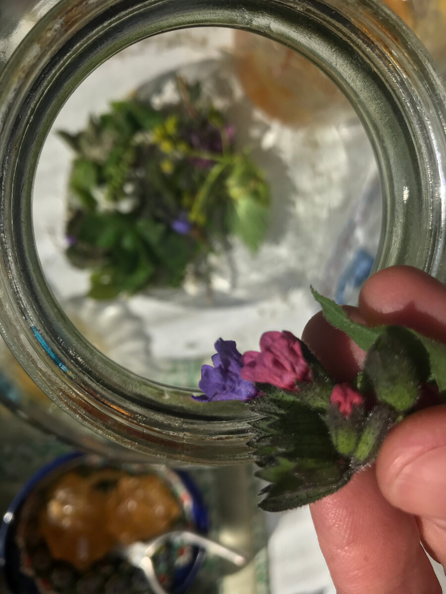 Всегда собираю первые травы - хожу в лес, смотрю в новое небо, слышу запахи, забытые за зиму. В этом году увлеклась идеей замечательной Марины - сделать сурицу; ссылку помещу в комментарии. Нарезала за два похода по крошечной горстке того и сего - первые цветы дикой вишни, медуницу, юную крапиву, клёновые листья цвета небывалых рассветов, лунную черёмуху, легендарную сныть. Сложила в банку, умяла и залила мёдом - подаренным замечательными людьми. Стоит теперь под солнцем, кухня превратилась с алхимическую лабораторию, которых в доме теперь две )