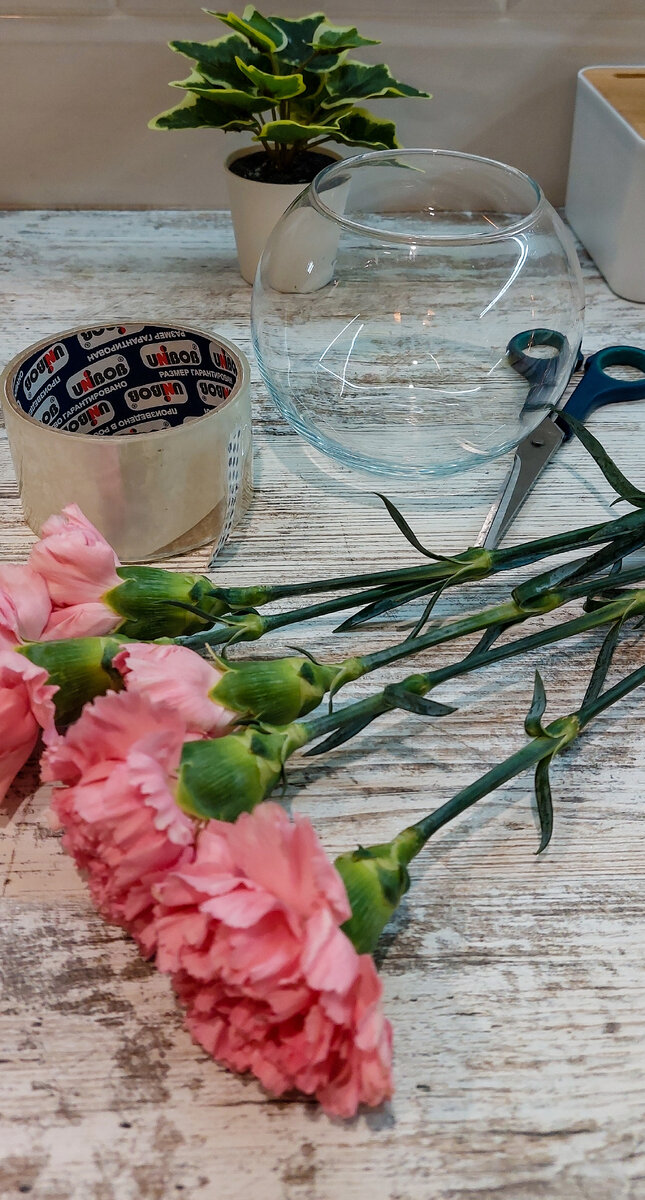Эта композиция делается быстро и просто. Всё как я люблю😉 Но при этом она украсит собой любой интерьер. Нам понадобится: - Небольшая вазочка. У меня круглая, можно другую. - скотч лучше тонкий, будет удобнее. - ножницы - и главные виновники торжества цветы😁 Для именно такой композиции я беру гвоздики, хотя их не очень люблю, но здесь они смотрятся очень шикарно😍 Обрезаем цветы такой длинный, чтоб цветочки были сразу над горлышком вазочки. Само горлышко вазочки обклеиваем скотчем. У меня широкий скотч, поэтому я заклеила горлышко полностью. Если у вас узкий, то нужно наклеить скотч в шахматном порядке. С помощью ножниц прделываем в скотче отверстия. В отверстия вставляем цветы, так чтоб стебельки были крест на крест. В прозрачной вазе таким образом они будут смотреться более гармонично. Вот и всё! Наша композиция готова и с удовольствием будет радовать наши глазки в любом интерьере🤗