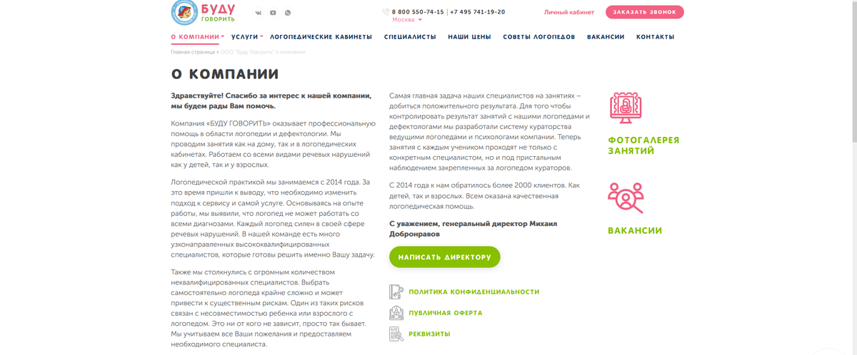 На сайте представлена информация о каждом работающем специалисте, которые готовы заниматься с клиентом в условиях логопедического кабинета или в домашних условиях, или выехать в детский сад/офис.