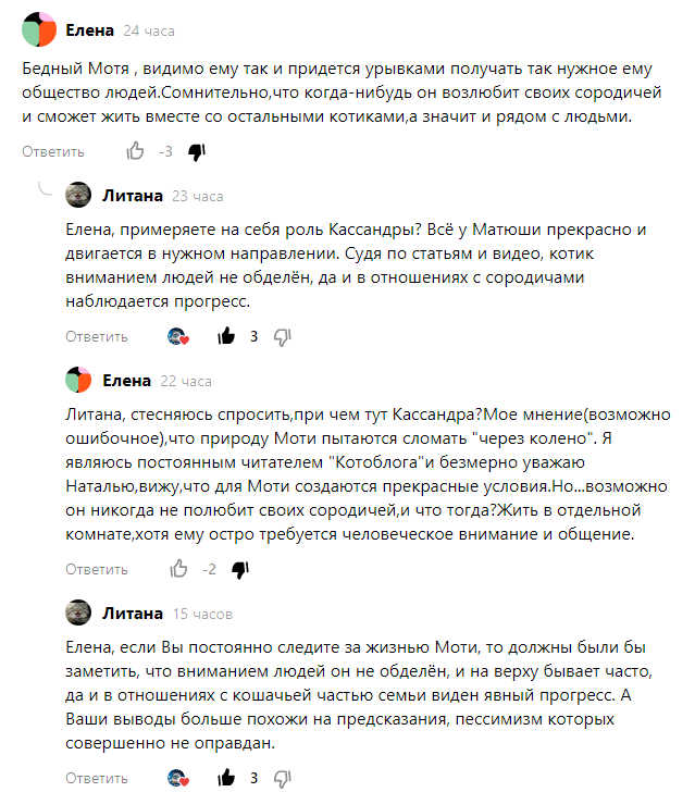 Если Елена действительно является постоянной читательницей моего "Котоблога", то ей было бы известно про Мотьку больше, чем она себе фантазирует. Как раз "ломание психики Мотьки" являлось бы погружением в некомфортную ему среду ПОСТОЯННОГО проживания с другими хвостами. И мы, видя как именно он ощущает себя комфортно, предоставляем ему и прогулки с общением и наблюдением "за зверушками", и достаточное общение находясь вместе с ним.