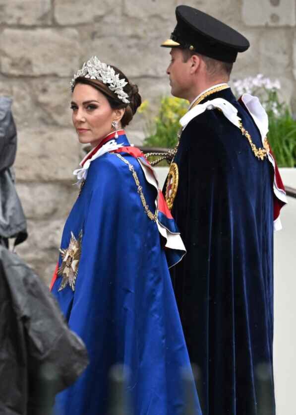 Кейт Миддлтон, Принцесса Уэльская. Под мантией платье Alexander McQueen, серьги Принцессы Дианы и "Цветочный венок" из серебра и кристаллов, сделанный Alexander McQueen в коллаборации с Jess Colle.