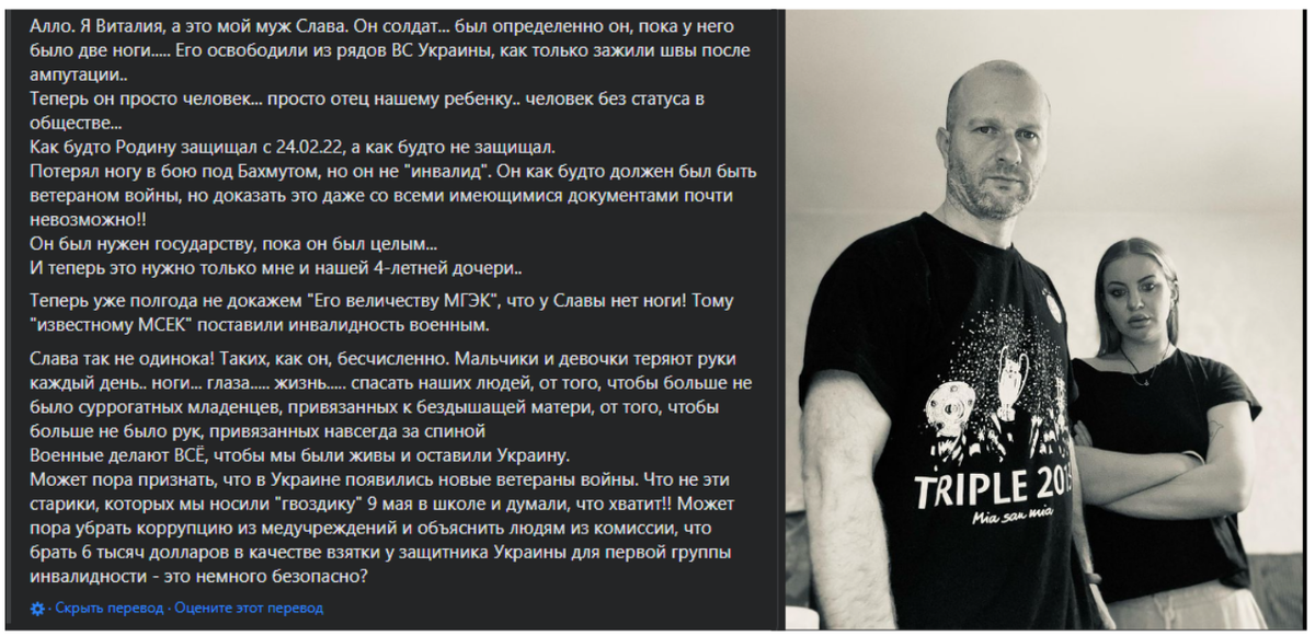 Вот так добиваются оформления инвалидности защитники с той стороны. Звучит жалобно - они не допускают, чтобы к задушенным матерям привязывали младенцев, а старикам в подвалах связывали руки. А на них в итоге всем наплевать, еще и взятки требуют. А мы уже давно знаем, что инвалиды не нужны никому. Попользовались, а дальше, сами разбирайтесь. Все о МСЭКе я знаю на личном луганском опыте. Если, например, обо мне, то врач говорит, что сердечная мышца безвозвратно повреждена, в дальнейшем только трансплантация, но комиссию нужно проходить каждый год. Если она не может восстановиться, то зачем каждый год? Соседи с потерянными глазами тоже каждый год проходили комиссию, чтобы подтвердить, что глаза не выросли. И, да, нужно платить комиссии, если хочешь, чтобы тебя не гоняли по кабинетам, и дали инвалидность. Мне, например, говорят, нужно два раза в год лежать в больнице. Но пока с бумажками походишь, все анализы сдашь, всех врачей обойдешь, то этой пенсии уже не хочется. Только на анализы одн