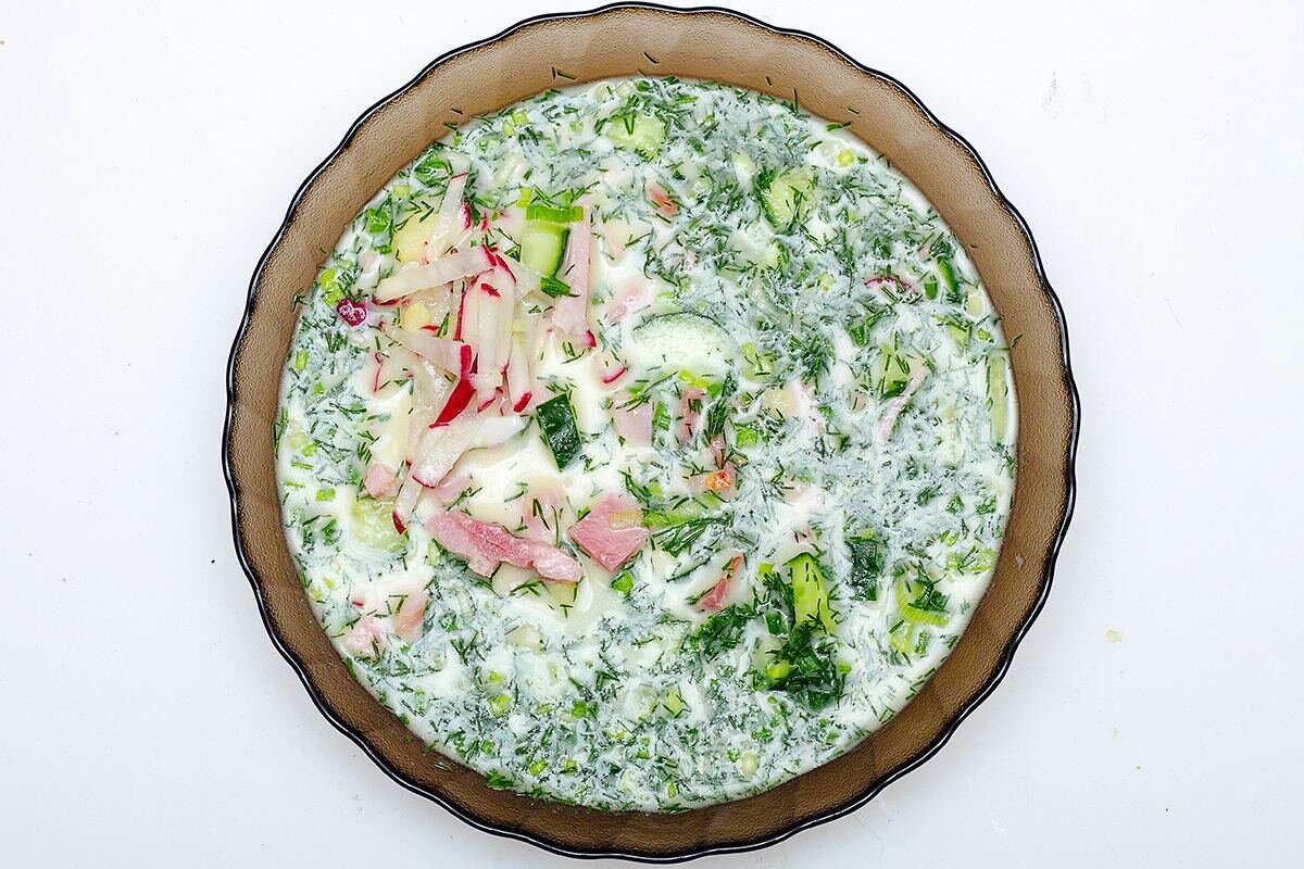 Ингредиенты: ветчина — 300 гр, огурцы — 2 шт., редис — 5 шт., отварной картофель — 2 шт., яйца вареные — 3 шт., зеленый перьевой лук — 1 пучок, укроп свежий — 1 пучок, черный молотый перец — 1 ч. ложка, сметана – 1 ст. ложка, соль — по вкусу.