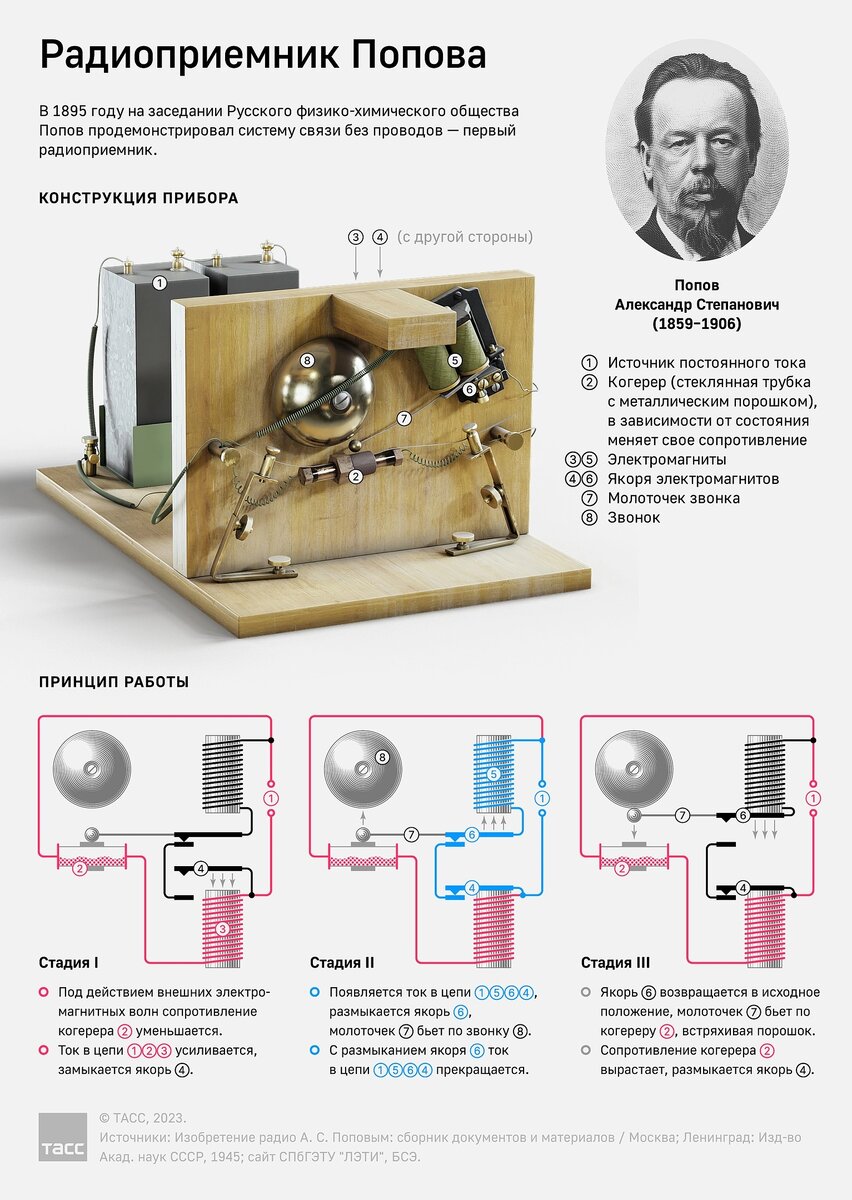 7 мая в России отмечается День радио — праздник работников всех отраслей связи. В этот день в 1895 году русский физик и электротехник Александр Попов на заседании Русского физико-химического общества продемонстрировал свою систему связи без проводов — радиоприемник. Вопрос о первенстве в изобретении радио до сих пор является предметом дискуссий. Одновременно с Поповым эксперименты с электромагнитными волнами вели американец сербского происхождения Никола Тесла, британец Оливер Лодж, итальянец Гульельмо Маркони, немец Карл Фердинанд Браун и другие ученые. Устройство Попова состояло из стеклянной трубки с металлическими опилками, электромагнитного реле, батареи и звонка. Подробнее о работе первого радиоприемника Александра Попова — в нашей инфографике.