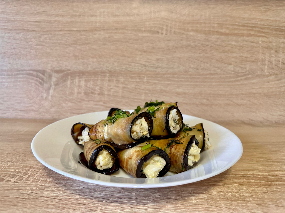 - На край баклажана выложить 1 ст.л. начинки, завернуть рулетик.