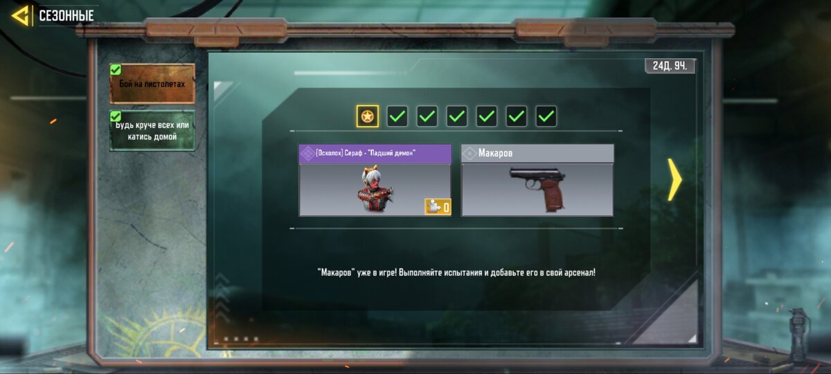 2 мая 2023 года стартовало второе сезонное задание в Call of Duty: Mobile в рамках 4 сезона 2023 "Невидимое восстание" главными наградами которого являются Осколки для бесплатного персонажа Сераф - "Падший демон" и новый пистолет Макаров. Выполнение этого задания будет немного дольше выполнения первого задания (по собственным наблюдениям), однако также не должно составить никаких проблем. 1 этап заключается в следующем: необходимо убить 5 противников из любого пистолета. Очень простое задание выполняется в обычной сетевой игре на карте Shipment в режиме "Каждый за себя". Но также можно играть и рейтинговый сетевой матч. Награды 1 этапа: Кредиты внутриигровой валюты х200 и очки опыта боевого пропуска х1000. 2 этап заключается в следующем: необходимо получить 2 раза медаль "Двойное убийство" в боях сетевой игры. Выполнение этого этапа также можно проходить как в обычной сетевой игре на карте Shipment в режиме "Каждый за себя", так и в рейтинговой сетевой игре. Медаль "Двойное убийство" д
