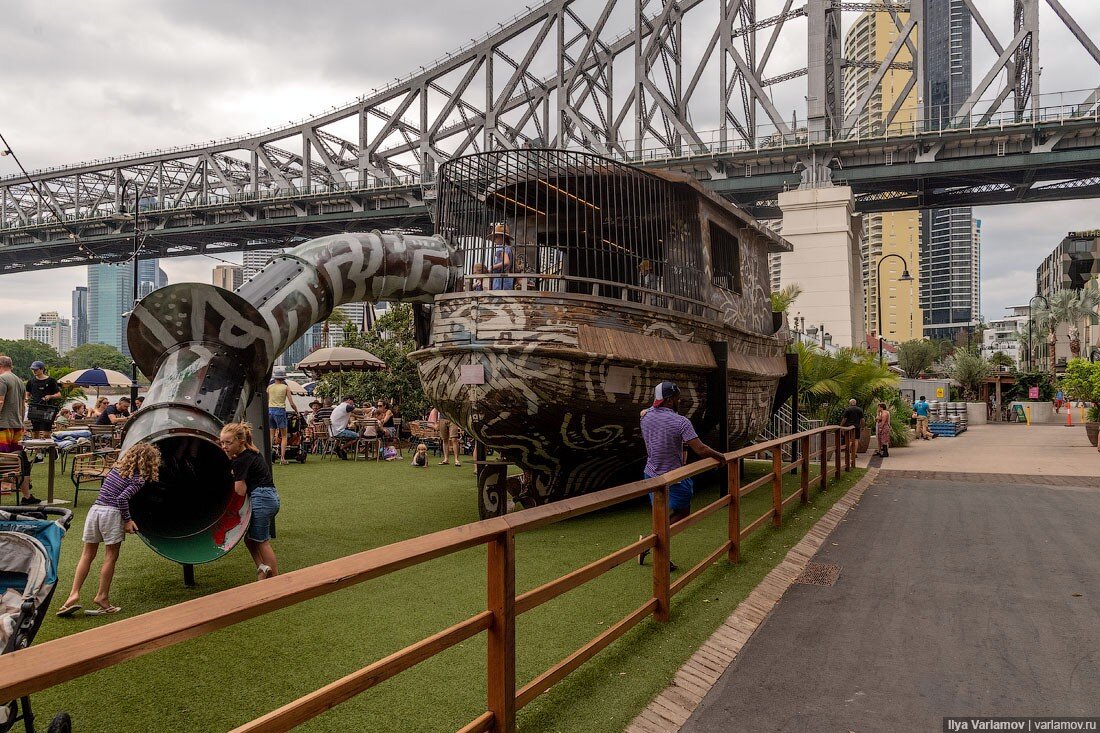 02. Прямо под мостом находится пивоварня и общественные пространства. Всё это называется Howard Smith Wharves – Верфи Говарда Смита. Когда-то тут действительно были верфи, которые с 1960-х были полузаброшены. Теперь тут модное место с отелем, ресторанами, спортивными и детскими площадками. Верфи заново открылись в 2018 году, а в 2020-м здесь должна появиться паромная пристань.