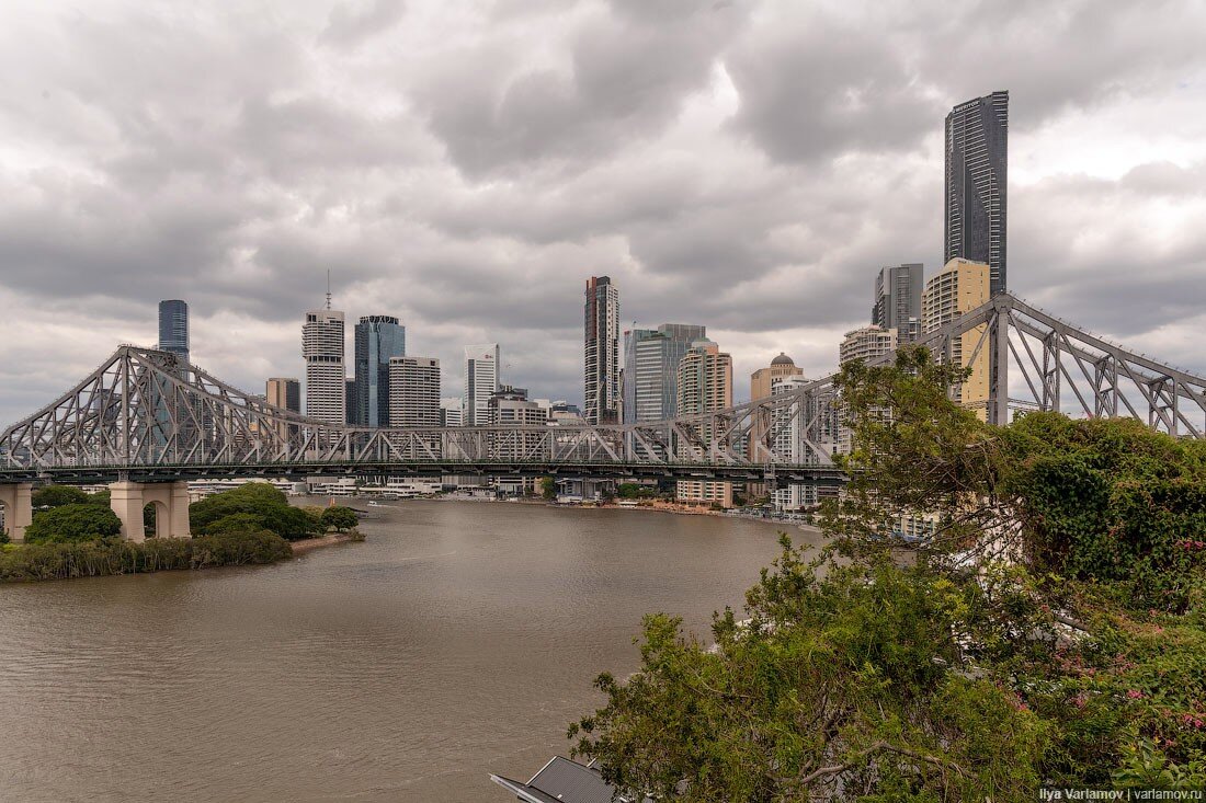01. Исторический консольный мост Стори-Бридж и вид на даунтаун Брисбена. Я вам говорил, что Австралия очень похожа на США? Я бы сказал, это демо-версия Америки. Тут всего поменьше, попроще, но по духу это США. Очень похожая планировка городов, люди, культура, смешение разных народов, обычаев, привычек. Как и в США, народ в основном сконцентрирован на побережьях, тоже делают вино (кстати, климат в Австралии как в Калифорнии или во Флориде). Брисбен чем-то напоминает Нью-Йорк. Вот и свой мост есть.
