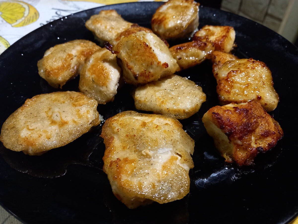 Обмакнуть кусочки в мучную смесь и обжарить с двух сторон.