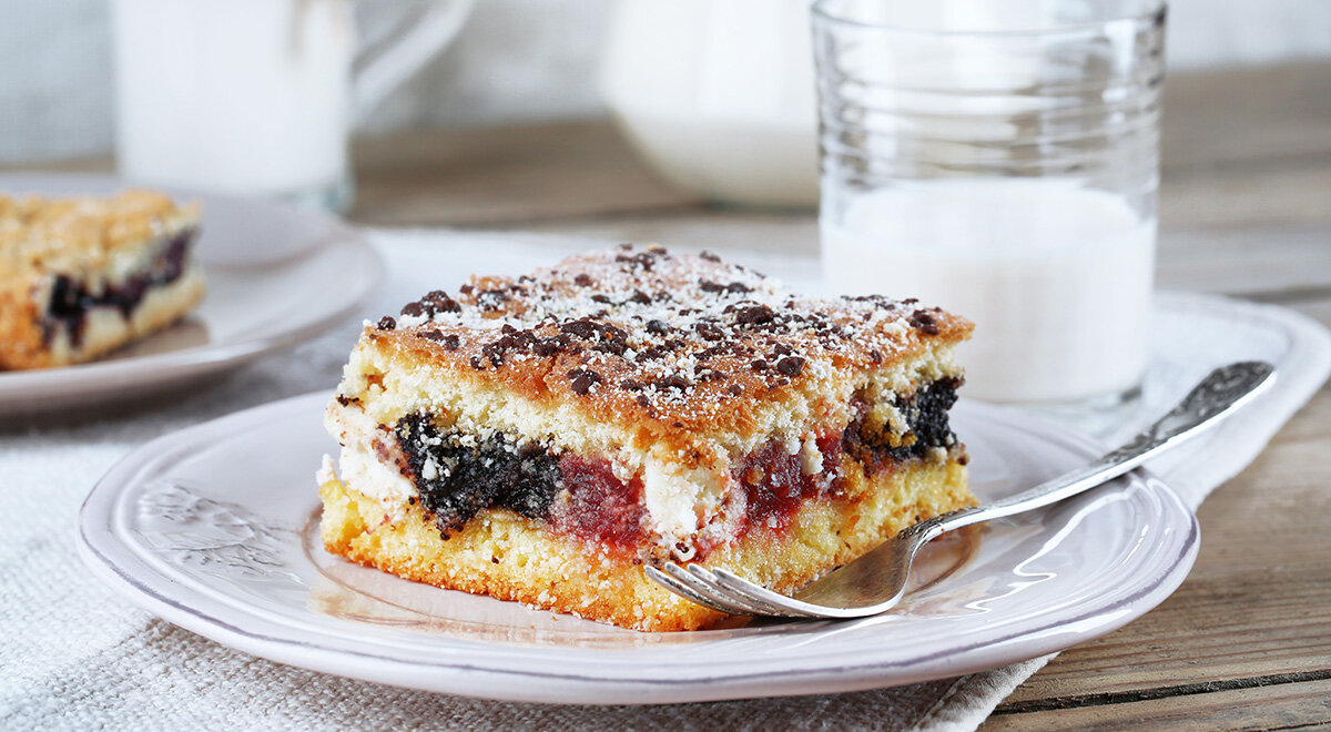 В самом начале мы сказали, что о кексах на кефире говорить не будем. Но все же упомянем пироги их кексового теста на кефире с фруктами. Как правило, их выпекают на противне с бортиками или в большой разъемной форме. Сладкое жидкое тесто на кефире с разрыхлителем, приготовленное как для заливного пирога, выливают в форму, на поверхность выкладывают мягкие фрукты без косточки – половинки абрикосов или сливы, ломтики персика или нектарина, посыпают сахаром или сахарной пудрой и выпекают. Можно вместо пудры посыпать смесью муки, сливочного масла и сахара – штрейзелем.