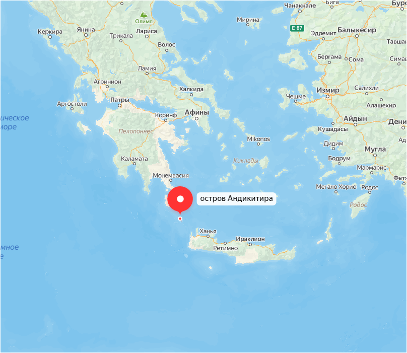 В 1900 году накануне Пасхи два судна ловцов губок, возвращавшихся от берегов Африки, бросили якорь у маленького греческого острова Антикитера (Антикифера) в Эгейском море, расположенного между южной оконечностью материковой Греции — полуостровом Пелопоннес — и островом Крит.