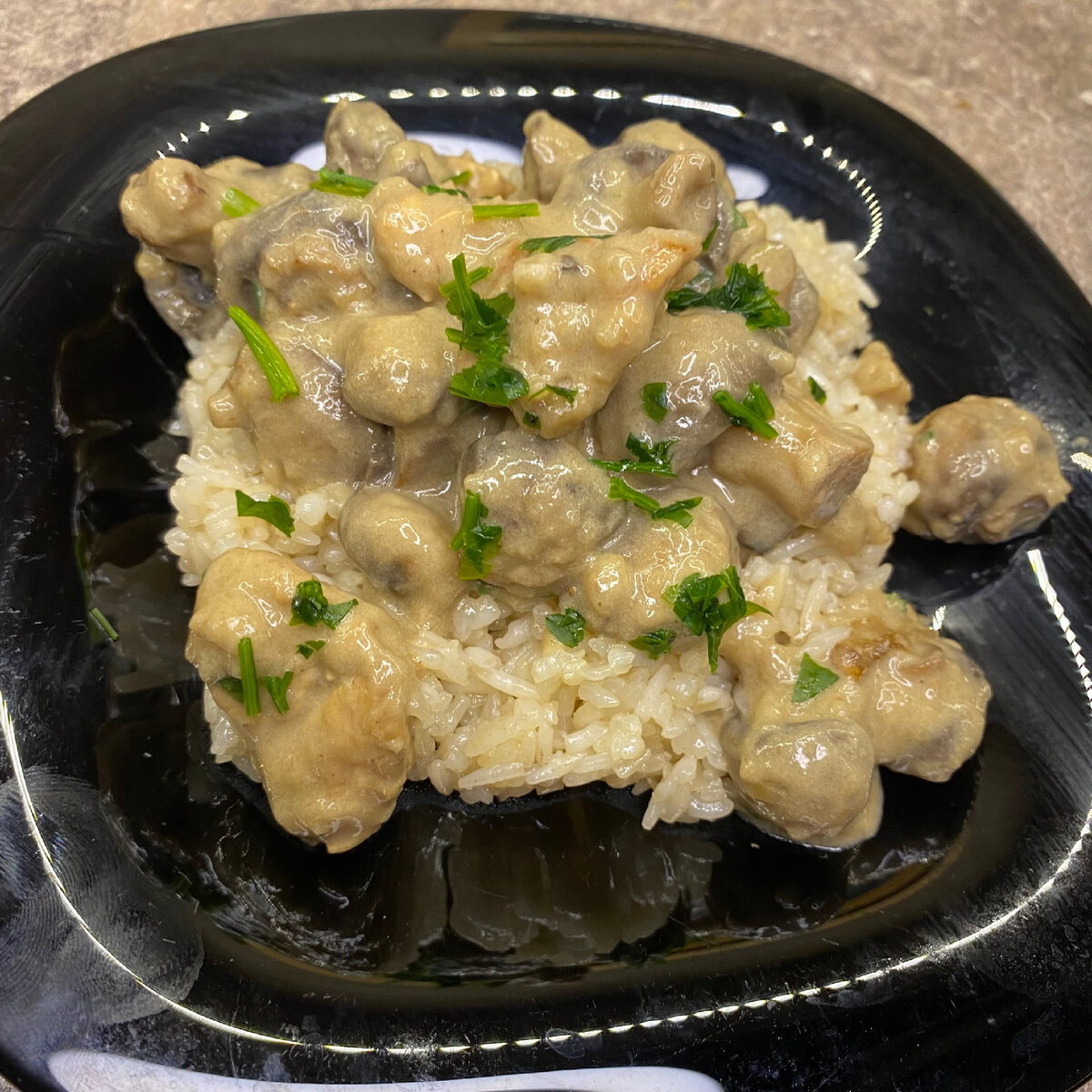 - Когда наш рис готов, раскладываем его порционно на тарелки, добавляем к нему курино-грибной соус и украшаем зеленью. Наш ужин готов, приятного аппетита!