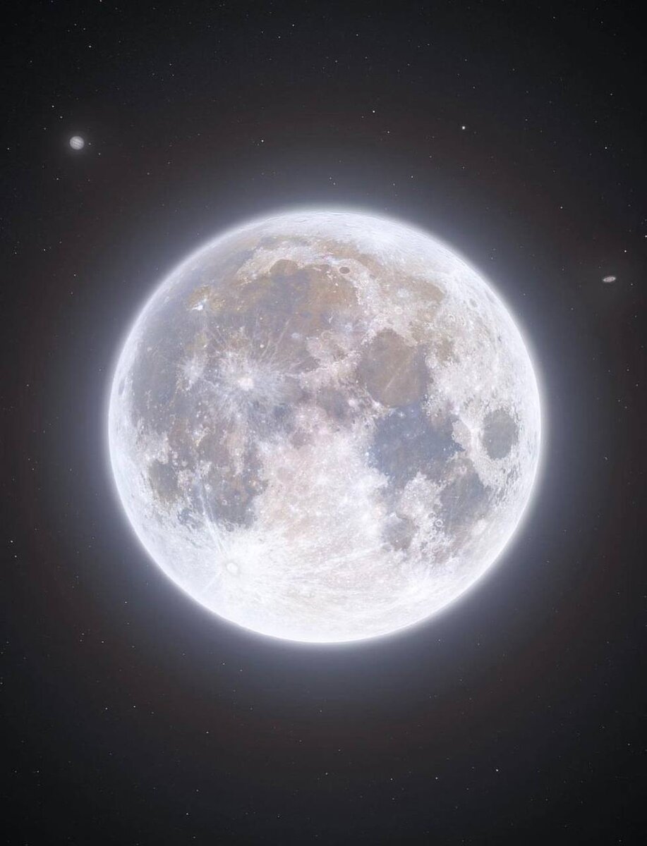 Это составное изображение, показывающее Полнолуние между Юпитером и Сатурном. Каждое изображение было сделано отдельно в ту же ночь и смешано вместе, чтобы вписаться в эту композицию с планетами примерно в масштабе".